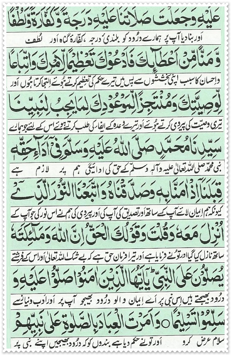 Transliteration: Sayyedena Muhammadenil lazi howa abha minal qamarit ta’aa mi wa akramu minas sahabil mursalaati wal bahril khadeem ALLAH humma salli alaa Sayyidena Muhammadini’n Nabbiyil ummi’yi wa ala’aa ali Sayyidena Muhammadini’l lazzi quri naatil barakatu bizaati hee wa mu hayya hoo wa ta’aatta ratlil awalimu be tibi zikri hee wa rayyah ALLAH humma salli alaa Sayyedena Muhammadin wa ala alaihee wa sallim ALLAH humma salli alaa Sayyedena Muhammadin wa ala’aa ali Sayyedena Muhammadin wa barik alaa Sayyedena Muhmmadin wa alaa aali Sayyedena Muhammadin war ham Sayyedena Muhammadun
